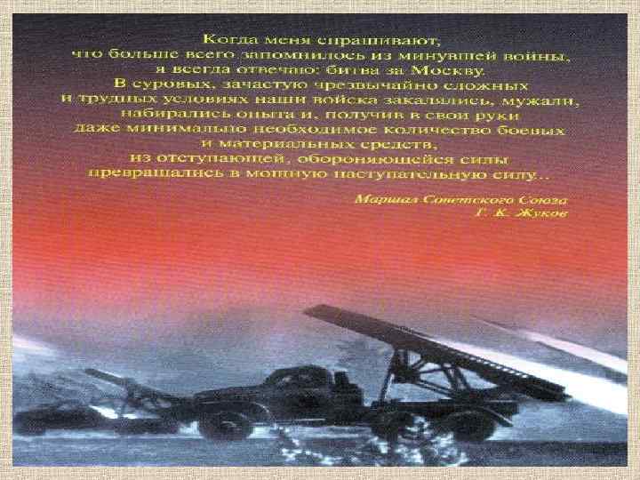 Неоценимо мужество и героизм советского народа в ходе сражения. Генерал-ма йор И. В. Па нфилов (сл с командир ева) ами штаба дивизии 7 ноября на Красной площади прошел парад. Его участники сразу же отправлялись на фронт. В сер. ноября немцы возобновили наступление, но столкнулись с отчаянным сопротивлением. Особо отличилась 316 дивизия ген. Панфилова. В это время к западу от Москвы советское командование сосредоточило мощные резервы и 56 декабря Красная армия нанесла контрудар. В результате немцы потеря ли 38 дивизий, они были отброшены от Москвы на 250 км, план «молниеносной войны» был сорван.