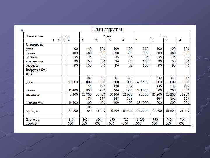 Общее описание: Магазин находится недалеко от дороги, вблизи остановок общественного транспорта. Магазин приближен к жилым зданиям, имеет удобную парковку. Торговый зал на 20 кв. м, холодильник для хранения цветов прямо в торговом зале 8 9 кв. м. Общая площадь 30 кв. м. Часы работы без выходных с 9. 00 до 21. 00. Небольшому магазину потребуются один продавец, консультант и водитель с личным автомобилем. Активность продаж зависит от сезона и числа праздничных дней. Объемы реализации начинают расти с февраля, а к 8 Марта достигают пика. Запланированное начало подготовки - ноябрь , в декабре открытие, чтобы захватить Новый годи подойти к 8 Марта. Проект по дисконтируемой стоимости окупает себя уже с 3 квартала 1 года существования. Планируемая наценка на товар – среднерыночная, составляет 60100% в обычные дни, с учетом праздничных дней до 150%.