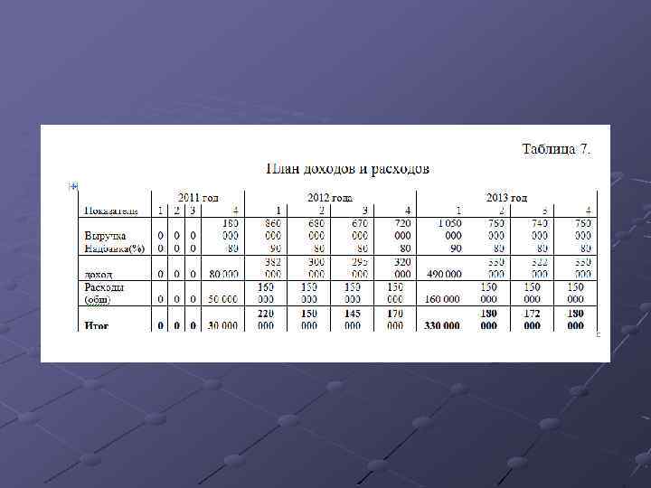Заключение Соответственно, если придерживаться данному плану то : Доход(2012 год) =1 297 000 Издержки(2012 год)=610 000 Читая прибыль=1 297 000 – 610 000 =687 000 рублей. Доход(2013 год) =1 472 000 Издержки(2013 год)=610 000 Читая прибыль=1 412 000 – 610 000 =812 000 рублей. Рентабельность составляет примерно 16% Срок окупаемости при начальном капитале в 200 000 если обратиться к таблице 7 приблизительно = 3 месяца 2 недели, т. е. конец первого квартала 2012 года. , но делая поправку на риски правильно будет захватить весь 1 квартал.