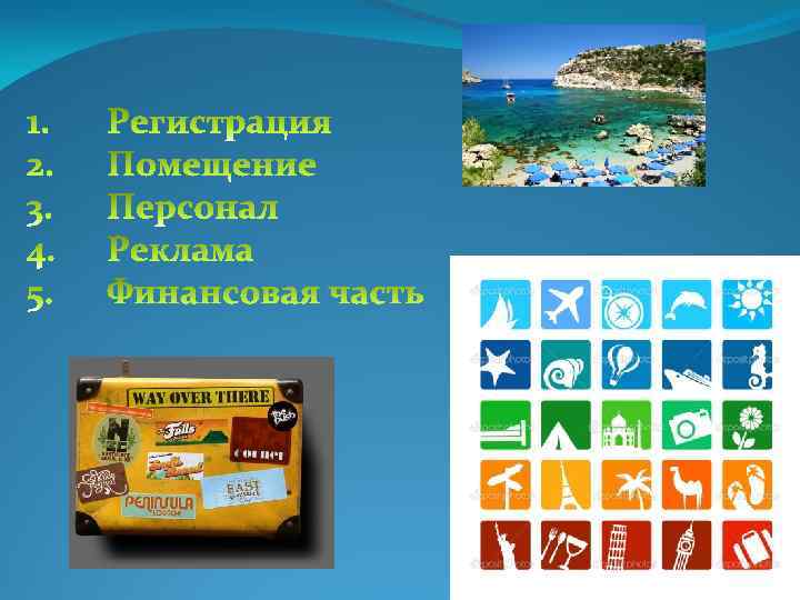 Регистрация туристической фирмы складывается из трех компонентов: 1. Регистрация юридического лица (ООО, ОАО, некоммерческая организация) либо ПБОЮЛ (от 5000 руб. ). 2. Оформление туристической лицензии (от 10000 руб. ). 3. Получение сертификата соответствия (от 2000 руб. ).