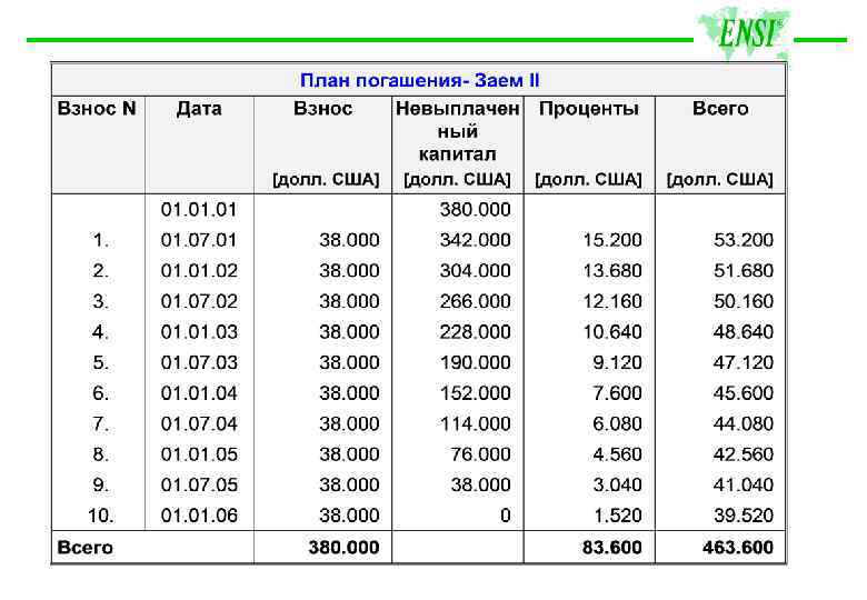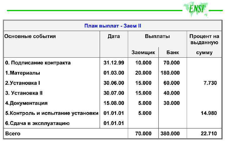 Пример движения наличности Финансовый план: План выплат (серийный заем):