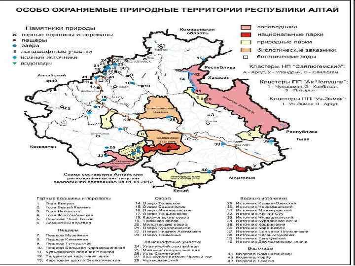 Расположение Республики Алтай § § § Россия Алтае-Саянский экорегион Республика Алтай Объект Всемирного природного наследия ЮНЕСКО «Алтай – Золотые горы» (1998 г) • Алтайский заповедник, • Телецкое озеро, • Катунский заповедник, • гора Белуха, • зона покоя Укок.