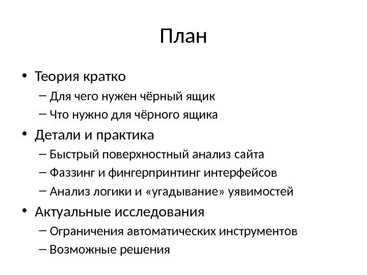 План • Теория кратко – Для чего нужен чёрный ящик – Что нужно для чёрного ящика • Детали и практика – Быстрый поверхностный анализ сайта – Фаззинг и фингерпринтинг интерфейсов – Анализ логики и «угадывание» уявимостей • Актуальные исследования – Ограничения автоматических инструментов – Возможные решения