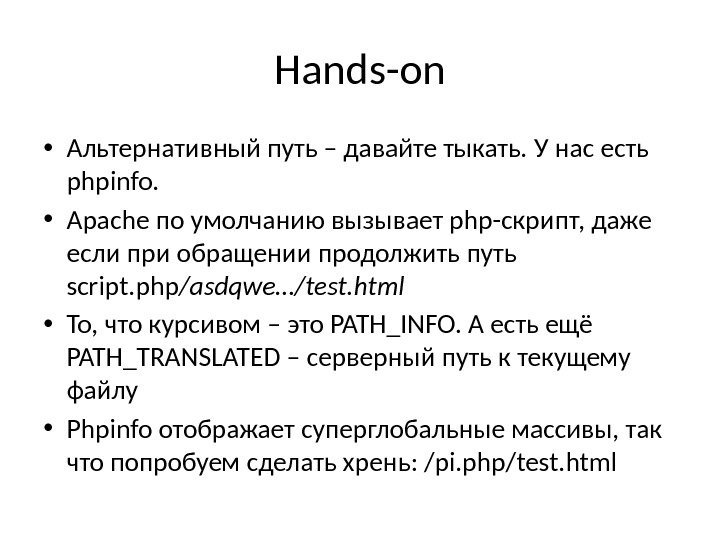 Hands-on • Альтернативный путь – давайте тыкать. У нас есть phpinfo. • Apache по умолчанию вызывает php-скрипт, даже если при обращении продолжить путь script. php /asdqwe…/test. html • То, что курсивом – это PATH_INFO. А есть ещё PATH_TRANSLATED – серверный путь к текущему файлу • Phpinfo отображает суперглобальные массивы, так что попробуем сделать хрень: /pi. php/test. html