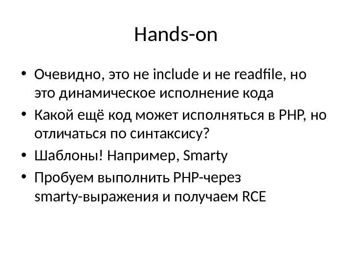 Hands-on • Очевидно, это не include и не readfile, но это динамическое исполнение кода • Какой ещё код может исполняться в PHP, но отличаться по синтаксису? • Шаблоны! Например, Smarty • Пробуем выполнить PHP-через smarty-выражения и получаем R