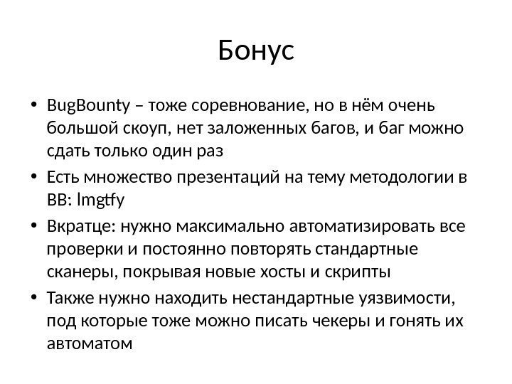 Бонус • Bug. Bounty – тоже соревнование, но в нём очень большой скоуп, нет заложенных багов, и баг можно сдать только один раз • Есть множество презентаций на тему методологии в BB: lmgtfy • Вкратце: нужно максимально автоматизировать все проверки и постоянно повторять стандартные сканеры, покрывая новые хосты и скрипты • Также нужно находить нестандартные уязвимости, под которые тоже можно писать чекеры и гонять их автоматом