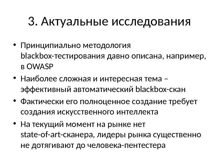 3. Актуальные исследования • Принципиально методология blackbox-тестирования давно описана, например, в OWASP • Наиболее сложная и интересная тема – эффективный автоматический blackbox-скан • Фактически его полноценное создание требует создания искусственного интеллекта • На текущий момент на рынке нет state-of-art-сканера, лидеры рынка существенно не дотягивают до человека-пентестера