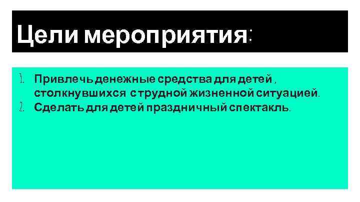 Цели мероприятия: 1. Привлечь денежные средства для детей , столкнувшихся с трудной жизненной ситуацией. 2. Сделать для детей праздничный спектакль.