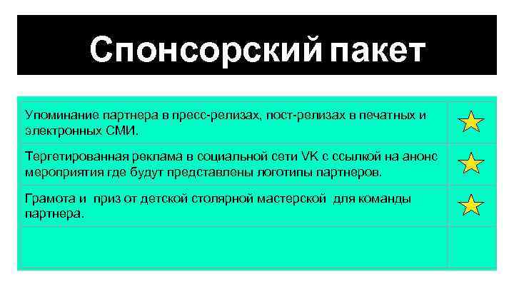 Спонсорский пакет Упоминание партнера в пресс-релизах, пост-релизах в печатных и электронных СМИ. Тергетированная реклама в социальной сети VK c ссылкой на анонс мероприятия где будут представлены логотипы партнеров. Грамота и приз от детской столярной мастерской для команды партнера.