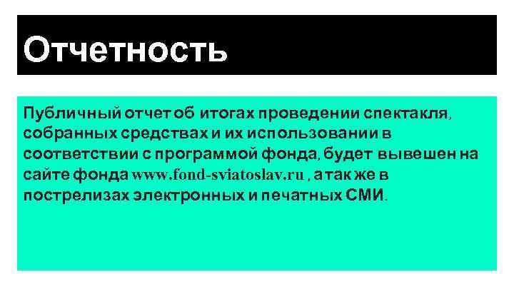 Отчетность Публичный отчет об итогах проведении спектакля, собранных средствах и их использовании в соответствии с программой фонда, будет вывешен на сайте фонда www. fond-sviatoslav. ru , а так же в пострелизах электронных и печатных СМИ.