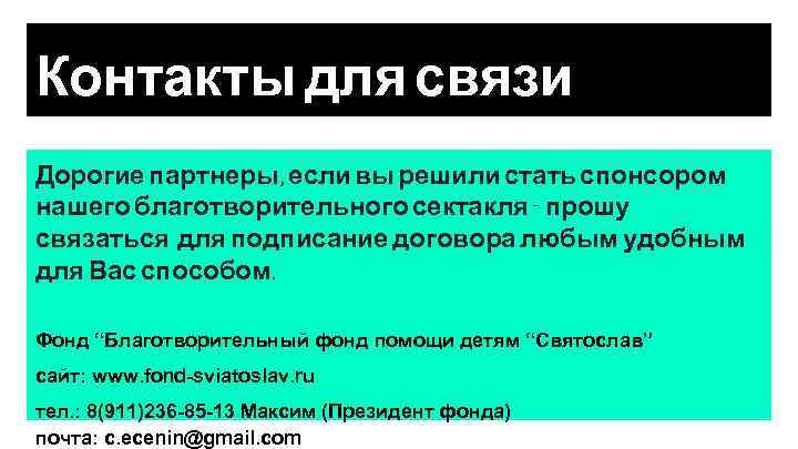 Контакты для связи Дорогие партнеры, если вы решили стать спонсором нашего благотворительного сектакля - прошу связаться для подписание договора любым удобным для Вас способом. Фонд “Благотворительный фонд помощи детям “Святослав” сайт: www. fond-sviatoslav. ru тел. : 8(911)236 -85 -13 Максим (Президент фонда) почта: c. ecenin@gmail. com