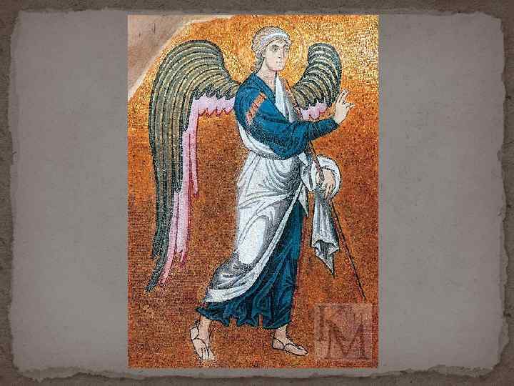 Благовещение в мозаиках триумфальной арки в церкви Марии Великой в Риме (Санта Мария Маджоре) 432 445 гг. Богоматерь в виде знатной женщины, роскошно одета и в идеальной обстановке. Она сидит на возвышении, ноги покоятся на подножии; на ней роскошное платье из богатой цветной материи; на голове убор, украшенный драгоценными камнями, в ушах серьги, нимба нет; в руках ее нитка шерсти оранжевого цвета. Возле нее стоят два ангела хранителя. Сверху слетают к Богоматери благовествующий и Св. Дух в виде голубя , что является исключительным примером в ряду древнейших памятников. Затем архангел благовестник представлен здесь во второй раз в момент самого благовестия. Вся картина имеет характер идеальный: Богоматерь не простая бедная женщина, но знатная особа; дейст вие происходит не в простой назаретской хижине, но в богатой обстановке, на ко торую указывает изображенное здесь богатое здание; ангелы служат Богоматери; архангел благовестник приносит ей весть о рождении от нее Спасителя мира.