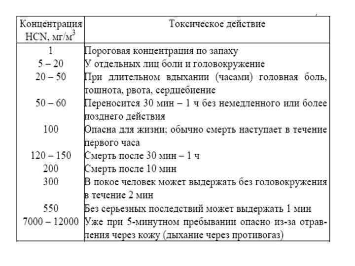 Повторение и хроническое отравление. HCN не накапливается в организме при повторных отравлениях, но вызываемые им нарушения постепенно углубляются. Возникают головная боль, слабость, быстрая утомляемость, общее недомогание, нарушение координации движений, потливость, приливы в виде гиперемии верхней половины туловища, повышенная раздражительность, тошнота, боли в подложечной области, диспептические расстройства, боли в конечностях, в сердце, тахикардия. Низкое давление, учащенное мочеиспускание, снижение фагоцитарной активности лейкоцитов, увеличение щитовидной железы, болезненная реакция на алкоголь