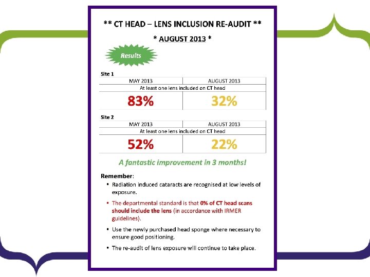 Further Recommendations § The positive results of the audit have been emailed to the radiographers and continued compliance is to be encouraged in departmental newsletters. § A further poster displaying the results of the audit has been displayed in the CT control room and staff room. § Re-audit will be performed in 9 months to monitor longterm compliance and the project has been added to the annual audit list.
