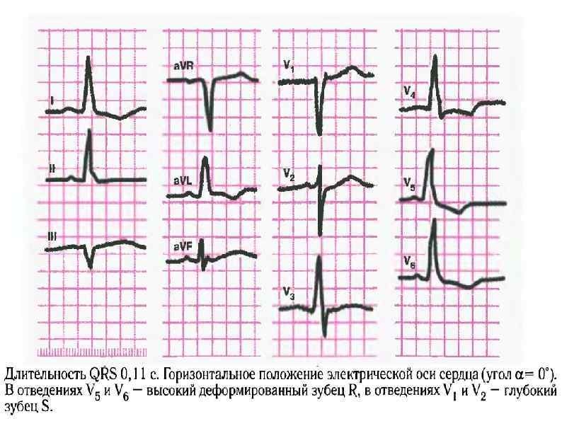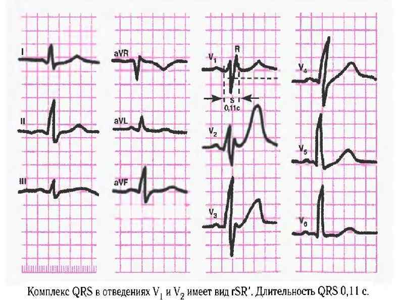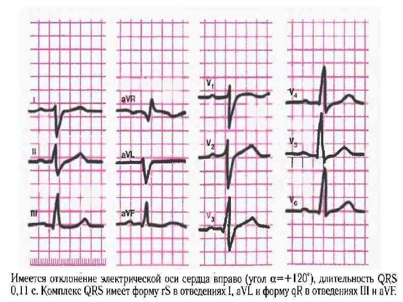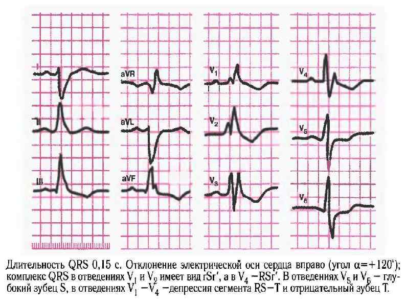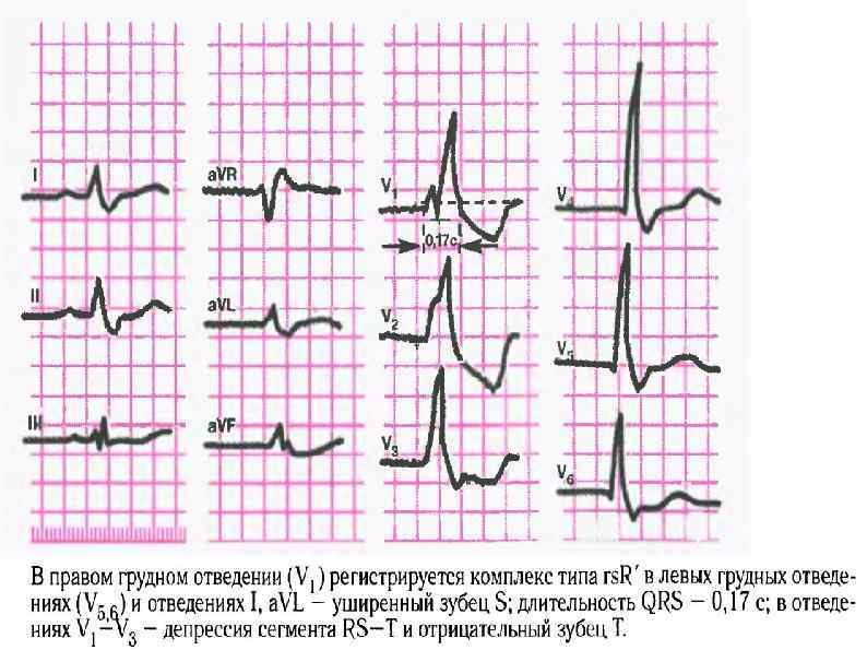 Этиология: 1) поражение ПЖ (легочное сердце, митральный стеноз, недостаточность трехстворчатого клапана, легочная гипертензия); 2) поражение ЛЖ (хроническая ИБС, острый ИМ, кардиосклероз, миокардиты, гипертоническое сердце); 3) интоксикация ЛП хинидина, передозировка B-адреноблокаторами, электролитные нарушения. ЭКГ-признаки: 1) наличие в правом грудном отведении V 1 QRS типа r. Sr или rs. R, а в отведениях I и V 6 - уширенного S. 2) увеличение QRS до 0, 11 с.