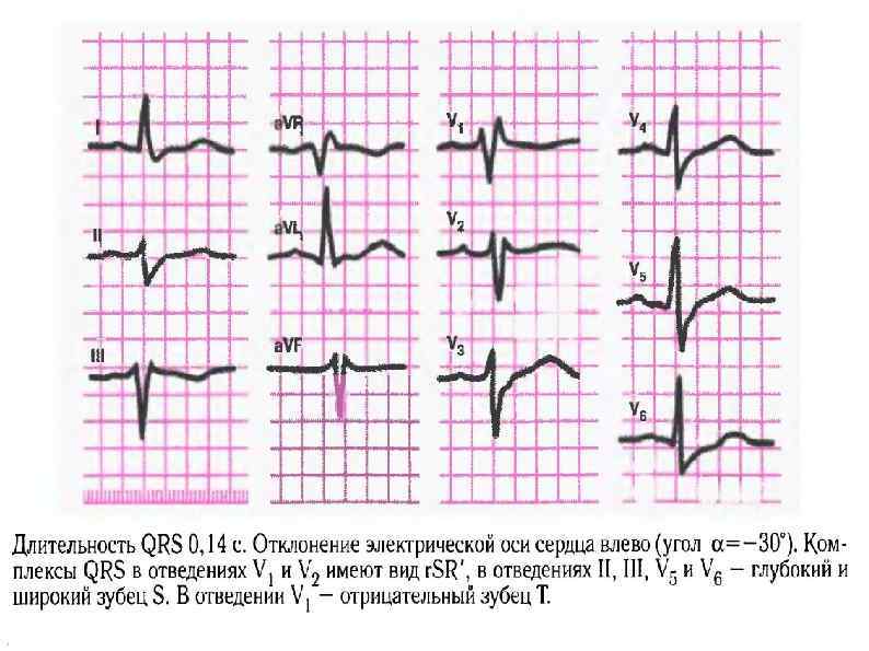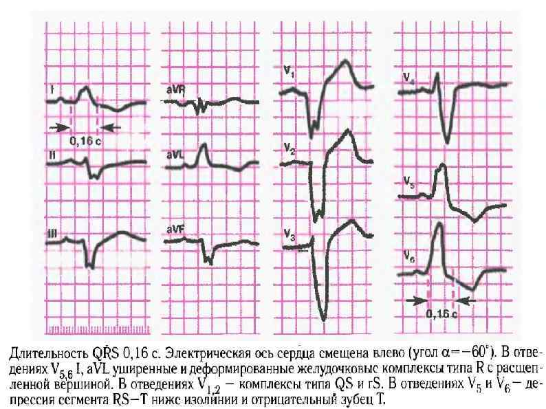 Этиология: острый ИМ, кардиосклероз, АГ, аортальные пороки сердца, коарктация аорты. ЭКГ-признаки: 1) наличие в отведениях I, a. VL, V 5, V 6 высоких, уширенных, расщепленных зубцов R; 2) наличие в отведениях III, a. VF, V 1, V 2 уширенных и углубленных комплексов QS или r. S; 3) увеличение длительности QRS до 0, 11 с.