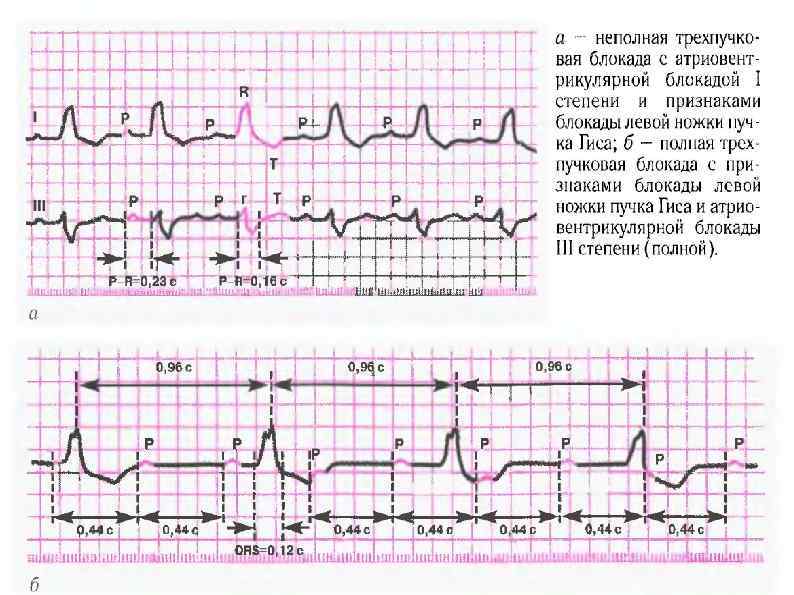 При трехпучковой блокаде электрический импульс проводится из предсердий к желудочкам по одной, более сохранной, ветви пучка Гиса (неполная блокада, часто сочетается с АВ-блокадой I или II степени), либо импульсы не проводятся совсем (полная блокада, часто сочетается с АВ-блокадой III степени). Полное разобщение предсердного и желудочкового ритмов. Этиология: хроническая ИБС, АГ, острый ИМ, болезнь Леви (фиброз МЖП), болезнь Ленегра (идиопатическая дегенерация, склероз и кальциноз внутрижелудочковой проводящей системы). ЭКГ-признаки: а) неполная блокада: 1) ЭКГ-признаки полной блокады двух ветвей пучка Гиса; 2) ЭКГ-признаки АВ-блокады 1 или 2 степени; б) полная блокада: 1) ЭКГ-признаки АВ-блокады 3 степени; 2) ЭКГ-признаки полной двухпучковой блокады.
