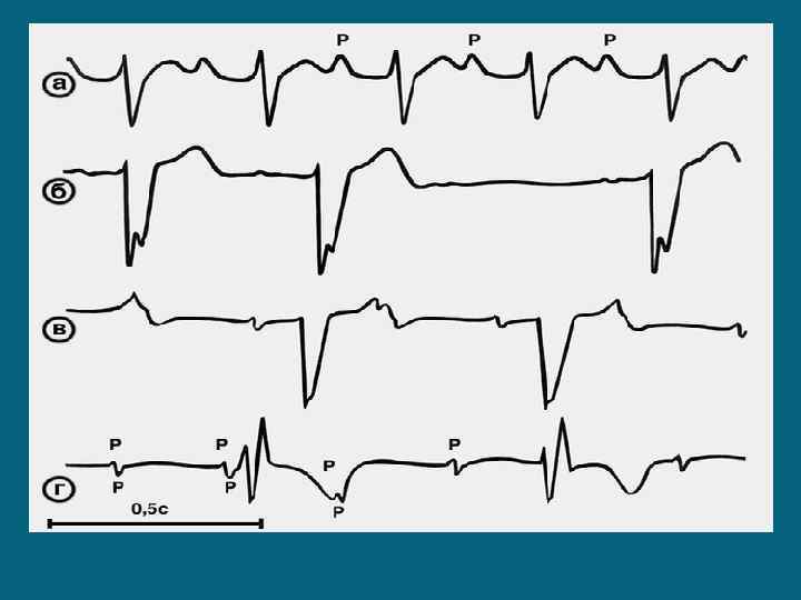 ЭКГ- признаки атриовентрикулярной блокады а — блокада I степени; интервал Р—Q до 0, 28 с; б — блокада II степени, тип Мобитц I; феномен Венкебаха; удлинение Р—Q в двух первых комплексах от 0, 24 до 0, 27 с, после третьего зубца Р комплекс QRST выпадает; в — блокада II степени, тип Мобитц II; комплекс QRST отсутствует после каждой второй волны Р (блокада 2: 1); г —блокада III степени: полная диссоциация предсердных и желудочковых комплексов; интервалы Р—Р — 0, 52 с (частота возбуждения предсердий 116 в 1 мин), R—R — 1, 32 с (идиовентрикулярный ритм — 45 в 1 мин).
