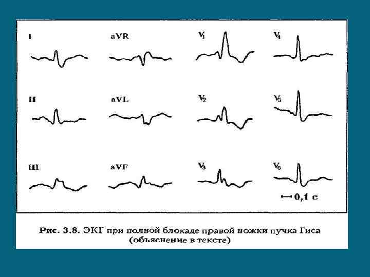 Основные электрокардиографические признаки блокады правой ножки пучка Гиса 1) увеличение продолжительности комплекса QRS; 2) увеличение продолжительности и деформация конечной части комплекса QRS. 3) отклонение электрической оси сердца (угла а) вправо; 4) дискордантные по отношению к QRS изменения реполяризации — депрессия сегмента ST, отрицательный асимметрич ный зубец Т в отведениях V, --V 2, III, a. VF ( 3. 8).