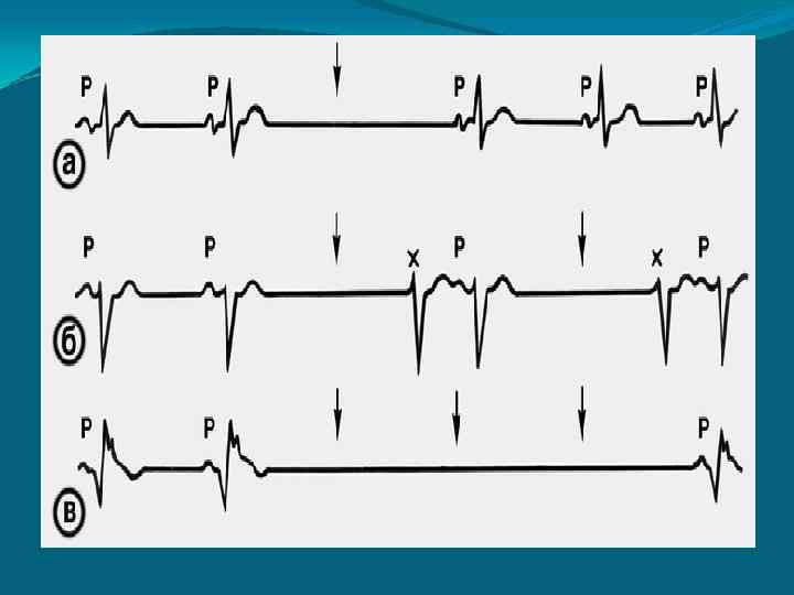 Синоатриальная блокада ЭКГ-признаки неполной СА-блокады: Синусовый ритм нарушается паузами за счет выпадения отдельных предсердно-желудочковых комплексов (стрелками указаны предполагаемые места зубца Р выпавших комплексов PQRST): а — выпадение одного комплекса, за счет чего интервал между вторым и третьим комплексами удваивается; б — повторяющиеся выпадения предсердно-желудочкового комплекса (блокада 2: 1) с появлением «выскакивающих» комплексов замещающего ритма из атриовентрикулярного соединения (отмечены крестиком) после каждого выпадения; в — резкое замедление проведения импульса из синусового узла, предшествующее асистолии ( «арест» синусового узла).