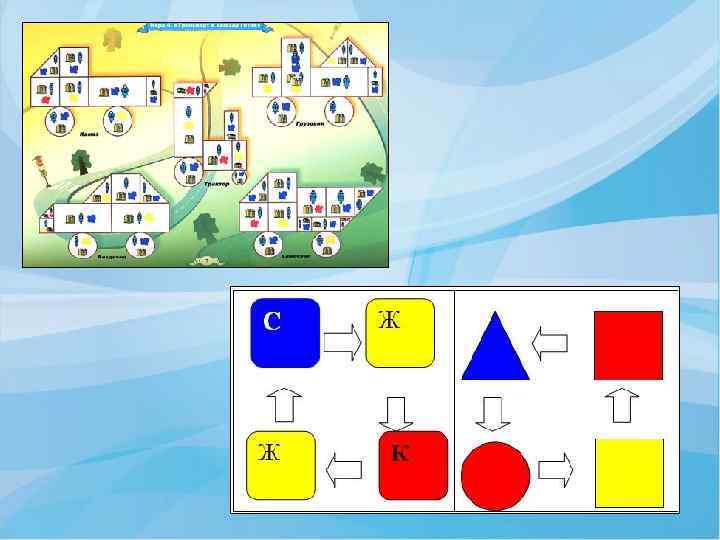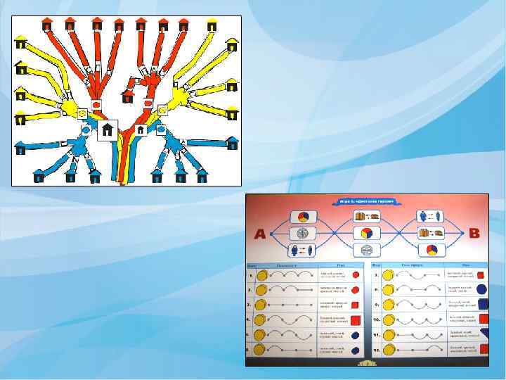 ФОРМЫ ОРГАНИЗАЦИИ РАБОТЫ С ЛОГИЧЕСКИМИ БЛОКАМИ v Занятия (комплексные, интегрированные), обеспечивающие наглядность, системность и доступность, смену деятельности. v Совместная и самостоятельная игровая деятельность (дидактические игры, настольно-печатные, подвижные, сюжетно-ролевые игры). а) в подвижных играх (предметные ориентиры, обозначения домиков, дорожек, лабиринтов); б) как настольно-печатные (изготовить карты к играм “Рассели жильцов”, “Найди место фигуре”); в) в сюжетно-ролевых играх: “Магазин” - деньги обозначаются блоками. “Почта” - адрес на доме обозначается кодовыми карточками. Аналогично, “Поезд” - билеты, места. v Вне занятий, в предметно-развивающей среде (ИЗО-деятельность, аппликация, режимные моменты, предметные ориентиры).