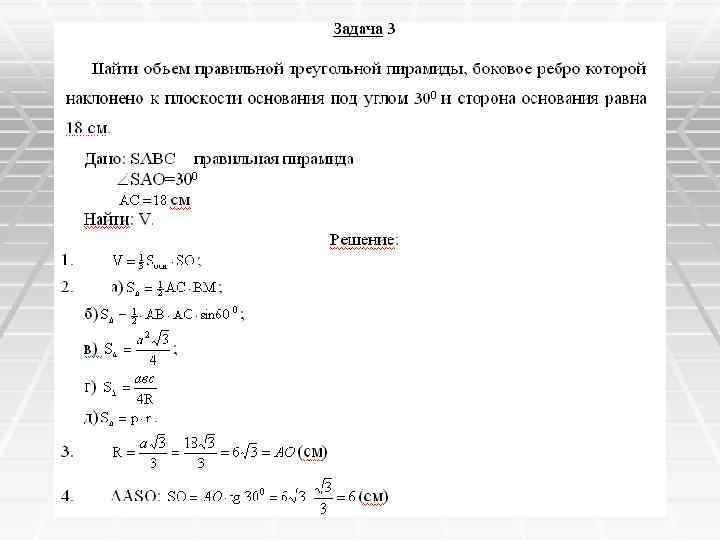 Дано: SABC – правильная пирамида, SA=BS=CS=12 см, ∟SAO=∟SBO=∟SCO=30º. Найти: V. Решение: 1. 2. а) б) в) г) д) 3. ∆ASO: SO=AS, SO=6 см или (cм);