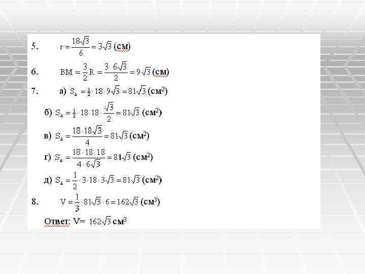 7. а) (см. кв. ) б) (см. кв. ) в) (см. кв. ) г) (см. кв. ) д) (см. кв. ) 8. Ответ: V= (см. куб. ) см. куб.