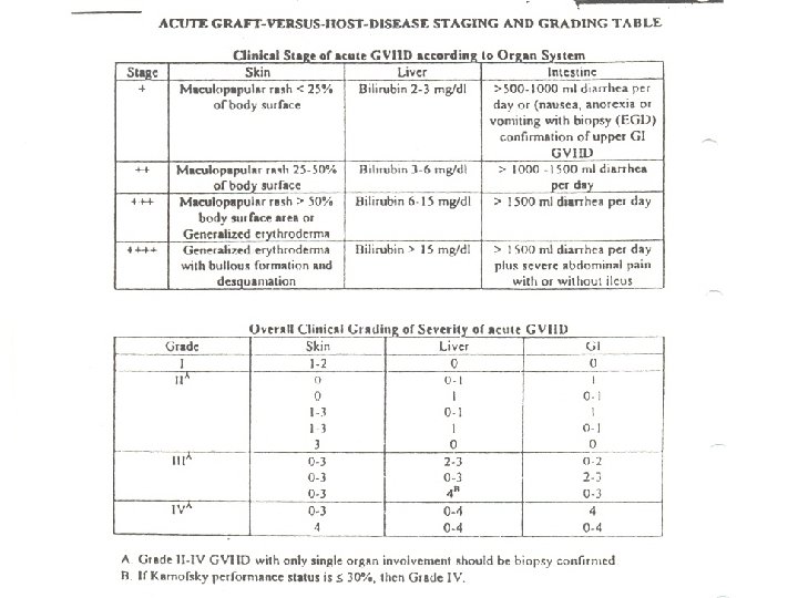 • Graft versus host disease – Occurs when donor stem cells recognizes the body of the recipient as foreign and attacks the body. – Acute GVHD occurs during engraftment: diarrhea, elevated bilirubin and rash – GVHD prophylaxis: cyclosporine IV, methotrexate IV