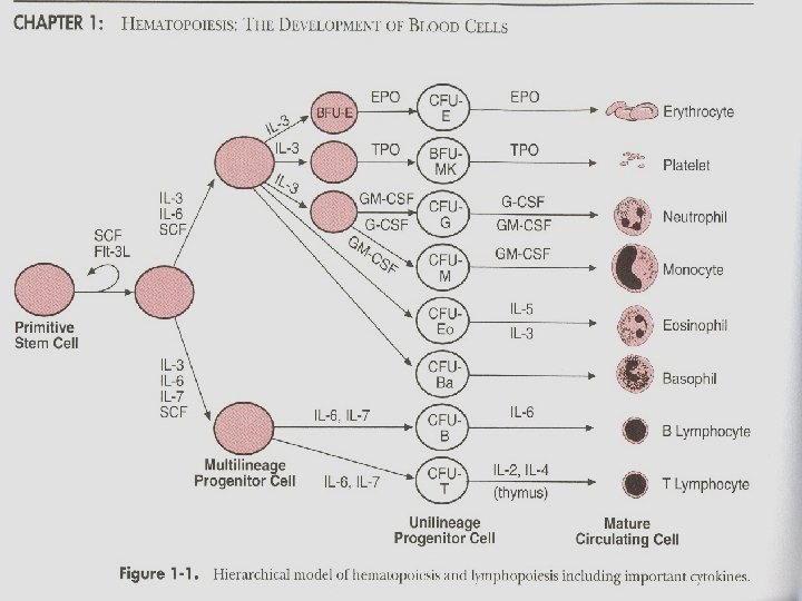 Stem cells • Young immature cells that make up 0. 5% to 5% of the marrow cells. • Express CD 34+ • Progenitor cells: self-renew and divide to become red and white cells, and platelets.