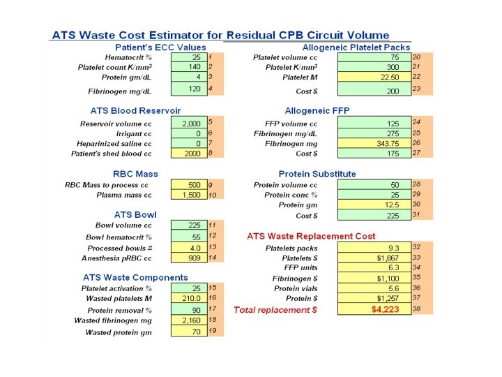 **The** Perfusionist Condense your Circuit Prime down safely to 1000 - 1400 mls ! Calculate the Post-Dilutional Hct, Protein, COP values RAP/VAP (Auto Prime) both sides of your Circuit with the help of Anesthesia and the Surgeon. This is not only proven very effective in many studies, and its $$$ economical as it costs nothing. Add Albumin / Osmitrol to Increase the COP / Diuresis of the patient. Limit the Cell Washer to the Pre and Post Heparinization periods! Use the pump’s Coronary Sucker during the Heparinization period to preserve frank Autologous Whole Blood lost outside the heart inside the pericardium and return it to back to the patient’s circulation. A waste sucker should be kept in the field for undesirable shed blood and irrigant solutions (or a cell washer for this as well).
