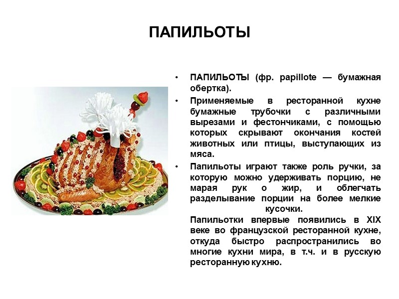ПАПИЛЬОТЫ ПАПИЛЬОТЫ (фр. papillote — бумажная обертка). Применяемые в ресторанной кухне бумажные трубочки с различными вырезами и фестончиками, с помощью которых скрывают окончания костей животных или птицы, выступающих из мяса. Папильоты играют также роль ручки, за которую можно удерживать порцию, не марая рук о жир, и облегчать разделывание порции на более мелкие кусочки. Папильотки впервые появились в XIX веке во французской ресторанной кухне, откуда быстро распространились во многие кухни мира, в т.ч. и в русскую ресторанную кухню.