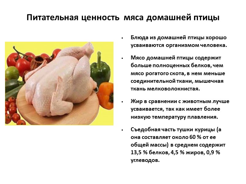 Питательная ценность мяса домашней птицы Блюда из домашней птицы хорошо усваиваются организмом человека. Мясо домашней птицы содержит больше полноценных белков, чем мясо рогатого скота, в нем меньше соединительной ткани, мышечная ткань мелковолокнистая. Жир в сравнении с животным лучше усваивается, так как имеет более низкую температуру плавления. Съедобная часть тушки курицы (а она составляет около 60 % от ее общей массы) в среднем содержит 13,5 % белков, 4,5 % жиров, 0,9 % углеводов.
