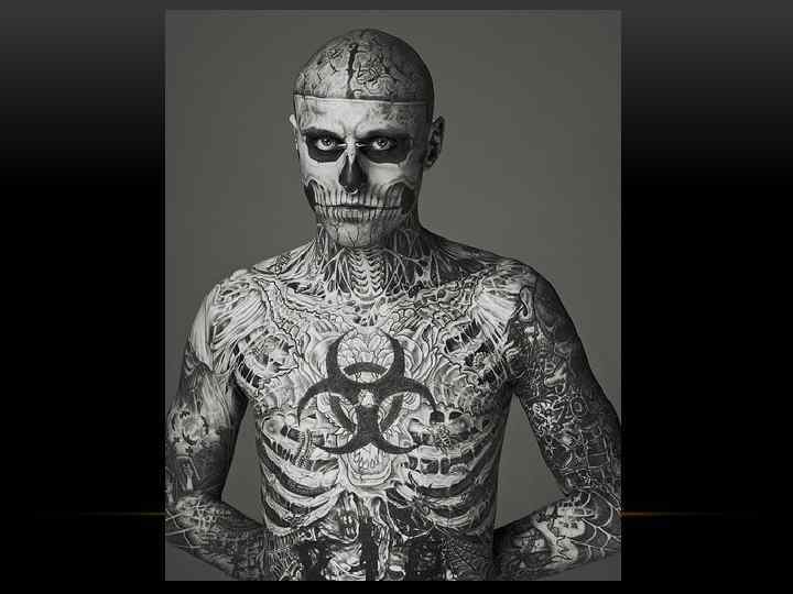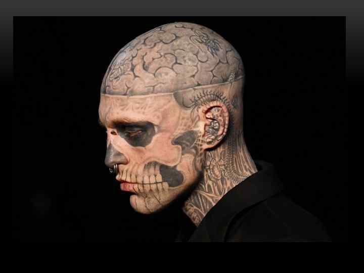ТАТУИРОВАНИЕ • Татуирование (с полинезийского — «метка» ) — виды модификации кожи, заключающиеся во вживленнии в слои кожи специального красящего пигмента. В отличие от росписи по телу рисунок сохраняется на всю жизнь. Сюда относятся перманентный макияж, а также, например, косметический татуаж бельма.