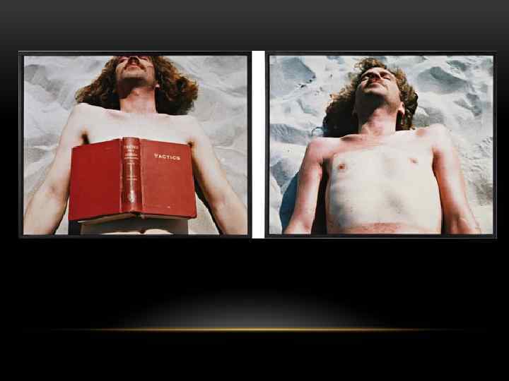 САМОДЕМОНСТРАЦИЯ ХУДОЖНИКА Самодемонстрация художника, этот вид представляет собой глубокое ответвление в постмодернизм. • Одна из наиболее известных работ Денниса Оппенгейма: художник лежал с книгой на груди под солнцем, пока его кожа, за исключением закрытой книгой, не загорела. • Крис Бёрден чаще всего использовал своё тело как объект для насилия. В «Стрельбе» (1971) Бёрден попросил своего друга выстрелить в него таким образом, чтобы слегка задеть руку, в результате художник был серьёзно ранен. Большая часть работ Бёрдена была связана с физическим риском. В «Тихо сквозь ночь» художник медленно продвигался по битому стеклу. Во время «Kunst Kick» (1974) ассистент пинал тело художника, который скатывался на две-три ступеньки вниз по лестнице. • Марина Абрамович представила «Rhythm O» в 1974 году. Публике была дана инструкция использовать « 72 инструмента боли и наслаждения» , включая ножи, перья и пистолет. Аудитория резала её, колола, расписывала губной помадой и снимала одежду. Перформанс продолжался шесть часов. Одна из её работ включала танец до изнеможения.