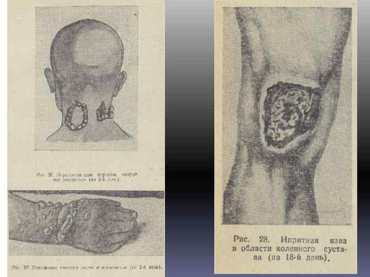Кожнонарывные Основные формы: 1. Клинические: • Лёгкая форма – острый ринофаринголарингит, который исчезает через 2 недели; • Средняя форма – развитие трахеобронхита, в дальнейшем приобретает хроническое течение • Тяжелая форма – очаговая ипритная пневмония, приводящая к развитию абцесса легкого и некротизации слизистой оболочки дыхательных путей. 2. Поражение кожи: • Эритематозная • Буллезная • Язвенно-некротическая с исходом в грубый рубец 3. Поражение глаз: • Серозный конъюктивит • Гнойный конъюктивит • Гибель глаза - панофтальм