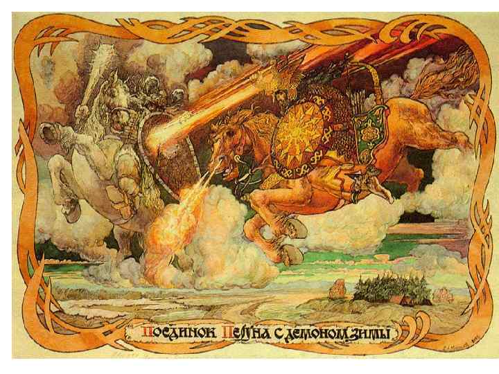 Перун ПЕРУНА не без оснований считают главным божеством языческого пантеона восточных славян. Перуна считают покровителем воинов и витязей. Перун - это прежде всего бог грозы, грома. Он вооружен палицей, луком со стрелами (молнии это стрелы, которые метал бог), и топором. В народных легендах Перуна иногда представляли в образе всадника, скачущего по небесам на коне или едущего на колеснице. Грохот от колесницы люди принимали за раскаты грома.