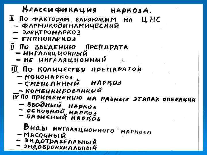 Общая анестезия. Наркоз - это временный функциональный паралич ЦНС, вызываемый общими анестетиками ( наркотическими веществами). Наркоз проявляется: - утратой сознания ( медикаментозный сон); - утратой всех видов чувствительности; - угнетением рефлексов. Общая анестезия это совокупность: защиты организма от операционной травмы + искусственная вентиляция лёгких +инфузионная терапия и пр.