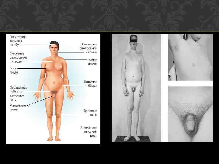 СИМПТОМЫ АНДРОГЕННОЙ НЕДОСТАТОЧНОСТИ Первичная андрогенная недостаточность при болезни Клайнфельтера связана с постепенной атрофией яичек, что приводит к резкому снижению синтеза мужских половых гормонов. Так что симптомы андрогенной недостаточности в разной степени выраженности есть практически у всех пациентов с болезнью Клайнфельтера. В первую очередь обращают на себя внимание внешние симптомы гипогонадизма: • скудная растительность на лице или же полное ее отсутствие; • рост волос на лобке по женскому типу (у женщин линия волос прямая, а у мужчин - в виде ромба, выступает по направлению к пупку); • волосы на груди и других частях тела отсутствуют; • вследствие атрофии яички уменьшаются в размерах, у многих больных имеется симптом "малые и твердые яички «; • поскольку полная дегенерация половых желез, как правило, развивается в постпубертатный период, у 60% пациентов размеры мужских половых органов, за исключением яичек, соответствуют возрасту. Как правило, начиная с 25 -летнего возраста пациенты начинают жаловаться на ослабление либидо и снижение потенции. Однако у многих мужчин с болезнью Клайнфельтера половое влечение вообще не возникает, а некоторые - напротив, заводят семью и живут нормальной половой жизнью. Так что наиболее постоянным признаком патологии является абсолютное бесплодие, как следствие азооспермии (отсутствия сперматозоидов в эякуляте). Кроме нарушения половой и репродуктивной функции недостаток андрогенов приводит к остеопорозу (снижению плотности костей) и слабости мускулатуры. Андрогены влияют на обмен веществ, поэтому больные с болезнью Клайнфельтера склонны к таким заболеваниям, как ожирение и сахарный диабет второго типа. Также статистически доказана предрасположенность таких пациентов к аутоиммунным заболеваниям (ревматоидный артрит, системная красная волчанка, аутоиммунные заболевания щитовидной железы).