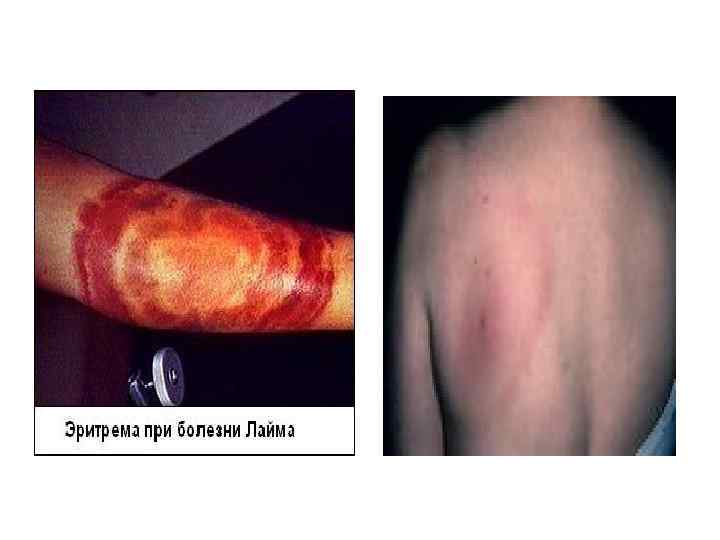 • По мере размножения возбудителя, он проходит в лимфогенные и гематогенные пути, заражает внутренние органы, суставы, ЦНС, при этом происходит частичная гибель возбудителя с выделением эндотоксина. Выделение эндотоксина даёт начало следующему периоду с клиническими проявлениями. • Период клинических проявлений неспецифичен, т. к кроме эритемы никаких специфических симптомов нет. Начало острое, и на первый план выступает лихорадочноинтоксикационный синдром: утомляемость, озноб, жар, подъём температуры, головная боль, головокружение, слабость, ломота в мышцах, боль в костях и суставах, нередки катаральные явления (першение в горле, сухость, кашель). Изза этих неспецифических симптомов, велика вероятность диагностических ошибок. С течением времени, участок эритемы в месте укуса начинает разрастаться во все стороны, поэтому её часто называют «мигрирующей» .