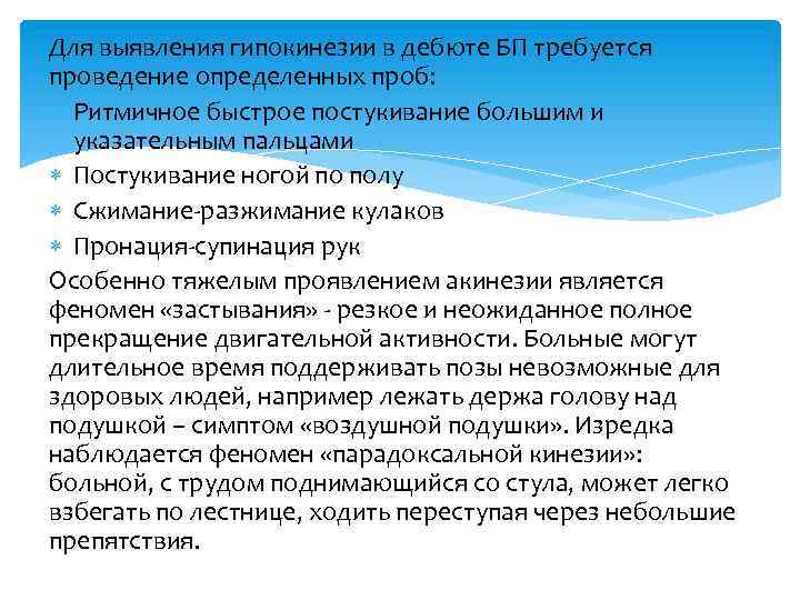 Для выявления гипокинезии в дебюте БП требуется проведение определенных проб: Ритмичное быстрое постукивание большим и указательным пальцами Постукивание ногой по полу Сжимание-разжимание кулаков Пронация-супинация рук Особенно тяжелым проявлением акинезии является феномен «застывания» - резкое и неожиданное полное прекращение двигательной активности. Больные могут длительное время поддерживать позы невозможные для здоровых людей, например лежать держа голову над подушкой – симптом «воздушной подушки» . Изредка наблюдается феномен «парадоксальной кинезии» : больной, с трудом поднимающийся со стула, может легко взбегать по лестнице, ходить переступая через небольшие препятствия.