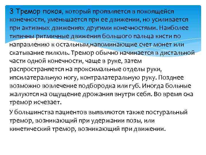 3 Тремор покоя, который проявляется в покоящейся конечности, уменьшается при ее движении, но усиливается при активных движениях другими конечностями. Наиболее типичны ритмичные движения большого пальца кисти по направлению к остальным, напоминающие счет монет или скатывание пилюль. Тремор обычно начинается в дистальной части одной конечности, чаще в руке, затем распространяется на проксимальные отделы руки, ипсилатеральную ногу, контралатеральную руку. Позднее возможно вовлечение подбородка или губ. Иногда больные жалуются на ощущение дрожания внутри себя. Во время сна тремор исчезает. У большинства пациентов выявляются также постуральный тремор, возникающий при удержании позы, или кинетический тремор, возникающий при движении.