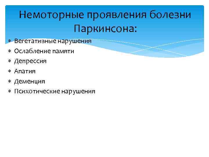 Немоторные проявления болезни Паркинсона: Вегетативные нарушения Ослабление памяти Депрессия Апатия Деменция Психотические нарушения