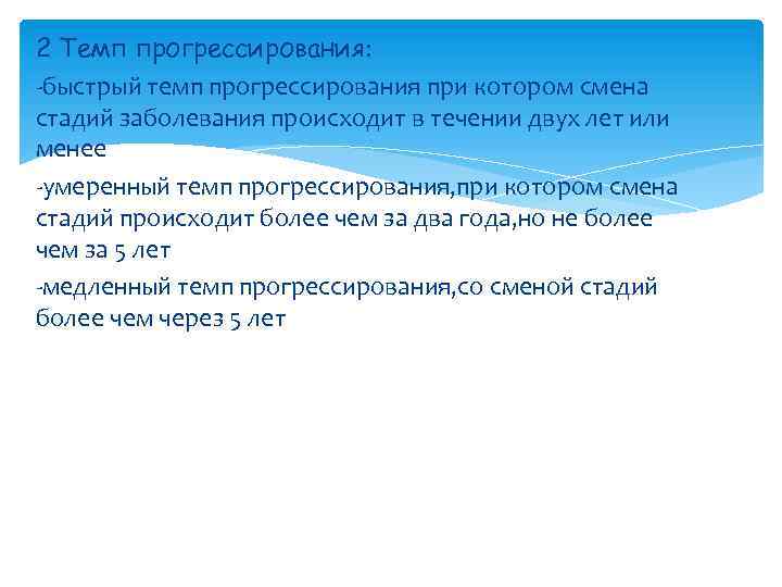 2 Темп прогрессирования: -быстрый темп прогрессирования при котором смена стадий заболевания происходит в течении двух лет или менее -умеренный темп прогрессирования, при котором смена стадий происходит более чем за два года, но не более чем за 5 лет -медленный темп прогрессирования, со сменой стадий более чем через 5 лет