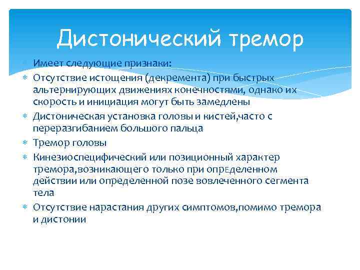 Дистонический тремор Имеет следующие признаки: Отсутствие истощения (декремента) при быстрых альтернирующих движениях конечностями, однако их скорость и инициация могут быть замедлены Дистоническая установка головы и кистей, часто с переразгибанием большого пальца Тремор головы Кинезиоспецифический или позиционный характер тремора, возникающего только при опр. Еделенном действии или определенной позе вовлеченного сегмента тела Отсутствие нарастания других симптомов, помимо тремора и дистонии