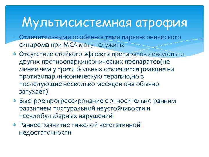 Мультисистемная атрофия Отличительными особенностями паркинсонического синдрома при МСА могут служить: Отсутствие стойкого эффекта препаратов леводопы и других противопаркинсонических препаратов(не менее чем у трети больных отмечается реакция на противопаркинсоническую терапию, но в последующие несколько месяцев она обычно затухает) Быстрое прогрессирование с относительно ранним развитием постуральной неустойчивости и псевдобульбарных нарушений Раннее развитие тяжелой вегетативной недостаточности