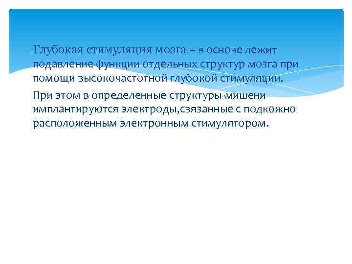Глубокая стимуляция мозга – в основе лежит подавление функции отдельных структур мозга при помощи высокочастотной глубокой стимуляции. При этом в определенные структуры-мишени имплантируются электроды, связанные с подкожно расположенным электронным стимулятором.
