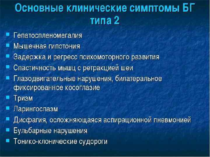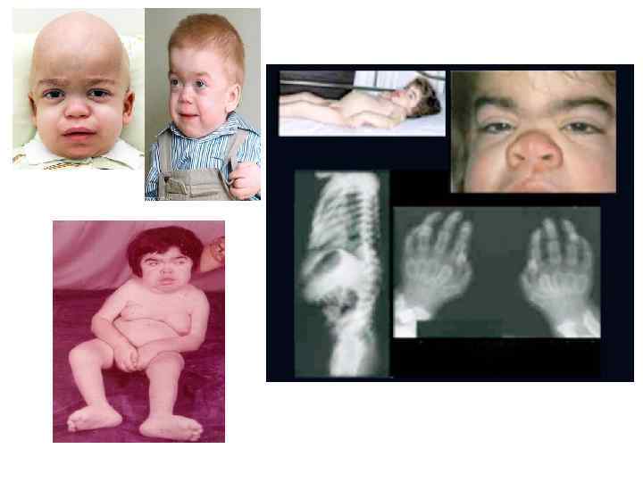 Мукополисахаридоз, тип IH (синдром Гурлер) • • клинические признаки заболевания появляются на первом году жизни, с пиком манифестации от 6 до 12 мес. Характерные изменения черт лица по типу гаргоилизма Другие частые манифестные симптомы - тугоподвижность мелких и крупных суставов, кифоз поясничного отдела позвоночника (поясничный гибус), хронические отиты и частые инфекционные заболевания верхних дыхательных путей. Практически у всех пациентов с синдромом Гурлер, так же как и при других типах мукополисахаридоза, кожные покровы плотные на ощупь. Часто встречается гипертрихоз. У единичных больных в возрасте до 1 года заболевание дебютировало с развития острой сердечной недостаточности, вызванной эндокардиальным фиброэластозом. По мере прогрессирования заболевания присоединяются симптомы, свидетельствующие о вовлечении в патологический процесс внутренних органов, сердечнолёгочной, центральной и периферической нервной систем. Ведущие неврологические симптомы - снижение интеллекта, задержка речевого развития, изменения мышечного тонуса, сухожильных рефлексов, поражение черепных нервов, комбинированная кондуктивная и нейросенсорная тугоухость. Прогрессирующая вентрикуломегалия часто приводит к развитию сообщающейся гидроцефалии. К концу первого и в начале второго года жизни появляются шумы в сердце, позднее формируются приобретённые аортальные и митральные пороки сердца. К концу второго года жизни выявляют гепатоспленомегалию и характерные скелетные нарушения по типу множественного дизостоза: короткую шею, задержку роста, тотальную платиспондилию, поясничный гибус, тугоподвижность мелких и крупных суставов, дисплазию тазобедренных суставов, вальгусную деформацию суставов, изменение со стороны кистей по типу «когтистой лапы» , деформацию грудной клетки в виде бочкообразной или колообразной. Часто наблюдается прогрессирующее помутнение роговицы, мегалокорнеа, глаукома, застойные диски зрительных нервов и/ или их частичная атрофия. Ранние рентгенологические признаки - деформация рёбер (по типу «вёсельных» ) и овоидная деформация тел позвонков, излишняя трабекуляция диафизов длинных трубчатых костей в сочетании с её недостаточностью в области метафизов и эпифизов. По мере прогрессирования заболевания формируется макроцефалия с утолщением костей свода черепа, преждевременным закрытием лямбдовидного и сагиттального швов черепа, уменьшение орбит, расширение спинки турецкого седла. Больные погибают обычно в возрасте до 10 лет от обструкции дыхательных путей, респираторных инфекций, сердечной недостаточности.