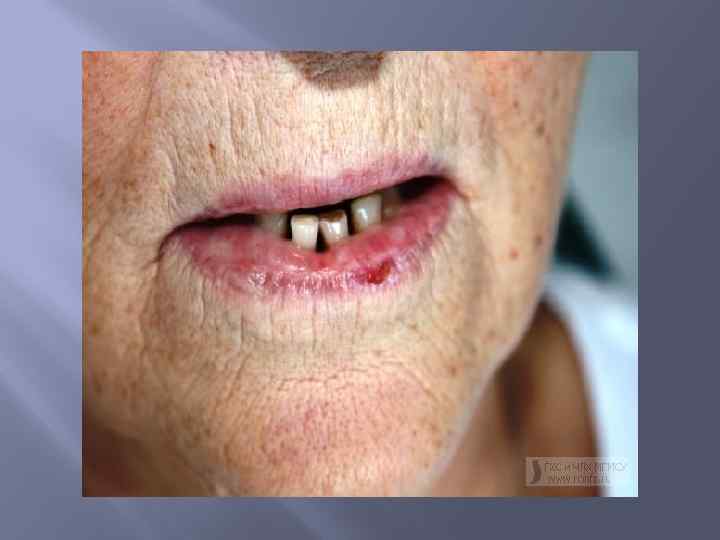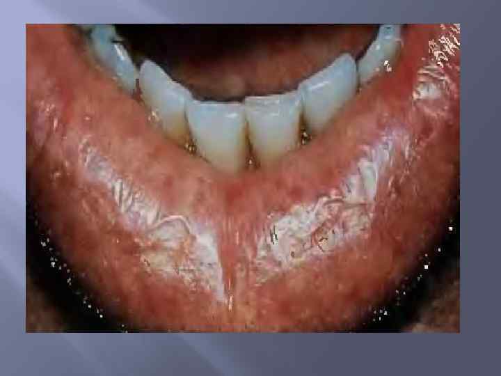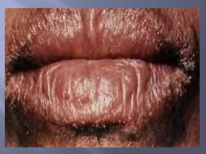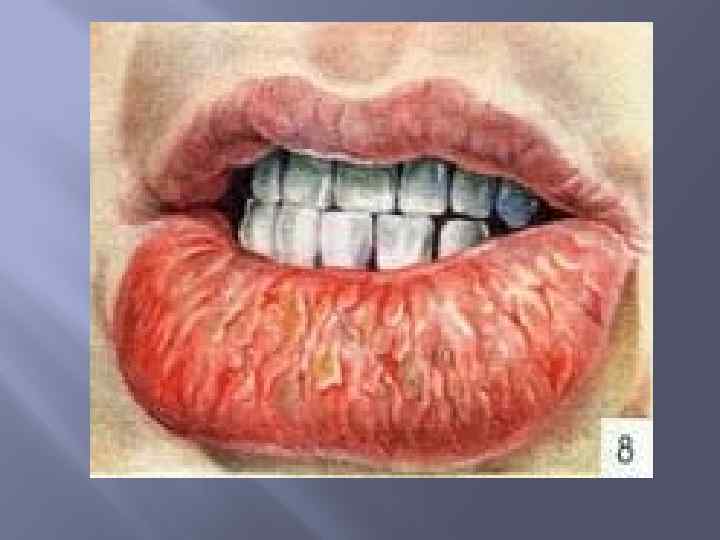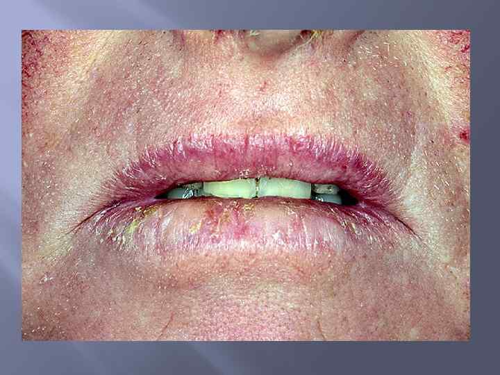 Эксфолиативный хейлит Этиология: нарушение функции нервной системы, различные проявления психопатологии, гиперфункция щитовидной железы. По клиническому течению выделяют сухую форму и экссудативную. Для обеих форм характерна локализация патологических изменений - поражается только красная кайма губ.