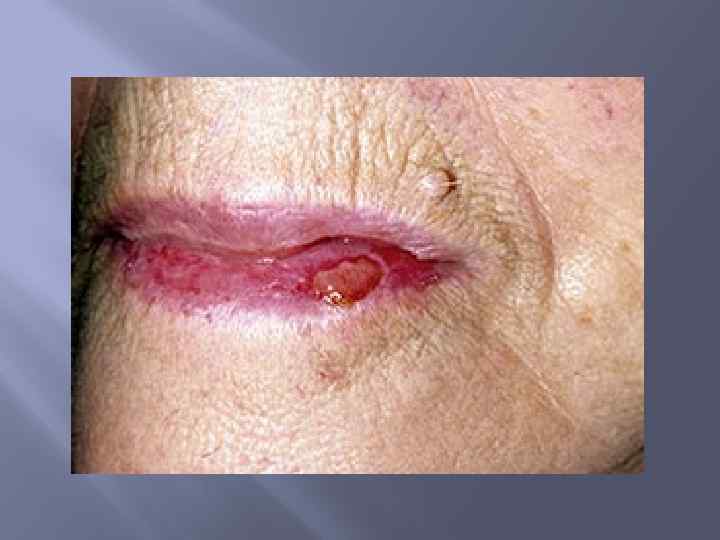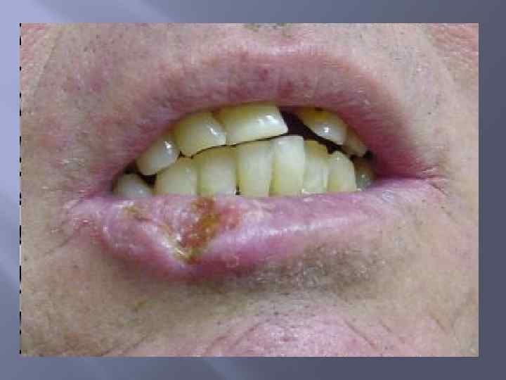 Актинический хейлит Это поражение нижней губы, вызванное чрезмерным воздействием солнечных лучей. На ранней стадии отмечают незначительный кератоз губы и стёртость границы между кожей и красной каймой. Если действие солнечных лучей продолжается, появляются небольшие очаги белесоватого цвета с чёткими или размытыми границами. Постепенно нижняя губа уплотняется, выпячивается, появляются шелушение, незначительный отёк, трещины. По мере развития процесса на губе появляются изъязвления, корочки.