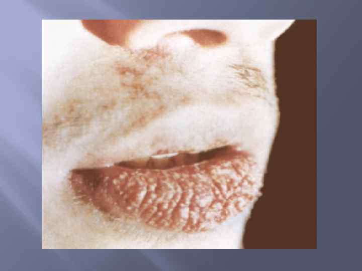 Метеорологический хейлит Обусловлен действием различных метеорологических факторов (ветер, холод, пониженная влажность, инсоляция и др. ). Чаще наблюдается у лиц, профессия которых связана с работой на открытом воздухе. Предрасполагает к развитию заболевания повышенная сухость кожи. Клинически характеризуется умеренной гиперемией и сухостью красной каймы, образованием мелких чешуек и трещин